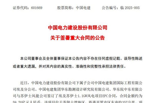 2月25日,中国电建发布公告,近日,公司下属子公司与苏伊士风能公司签署了埃及苏伊士1.1GW风电项目EPC合同,合同金额约为59.7亿元人民币。该项目位于苏伊士湾地区,距离开罗市区东南约357公里,主要工程内容包括1.1GW风电场区及场内三座升压站的设计、采购、施工、安装、调试、试运行及质保工作。 项目的总工期约为30个月,此次签署...