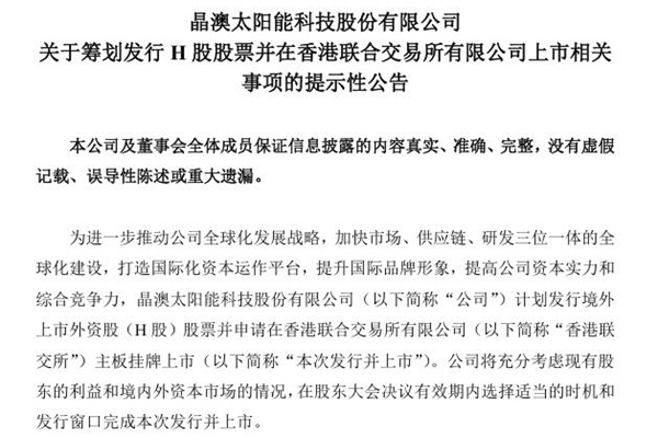 2025年02月22日,晶澳太阳能科技股份有限公司发布《关于筹划发行 H 股股票并在香港联合交易所有限公司上市相关事项的提示性公告》。 公告显示,为进一步推动公司全球化发展战略,加快市场、供应链、研发三位一体的全球化建设,打造国际化资本运作平台,提升国际品牌形象,提高公司资本实力和综合竞争力,晶澳太阳能科技股份有限公司计划发行境外上...