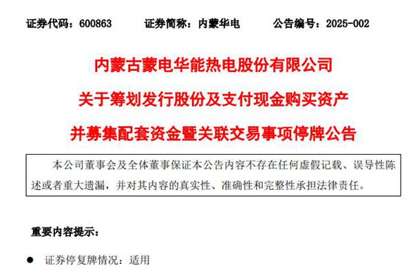2月10日,内蒙古蒙电华能热电股份有限公司(简称:内蒙华电)发布公告称,公司拟筹划购买控股股东北方联合电力有限责任公司(下称“北方公司”)旗下两家新能源公司的股权,并发行股份募集配套资金,以加快清洁新能源业务的发展步伐。公司股票将于2025年2月11日开始停牌。 据悉,此次交易标的分别为北方上都正蓝旗新能源有...