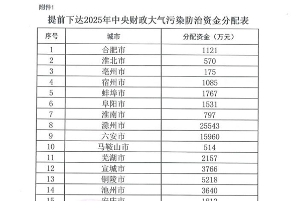 安徽省财政厅 安徽省生态环境厅关于提前下达2025年中央财政大气污染防治资金的通知 各市财政局、生态环境局: 根据《财政部关于提前下达2025 年大气污染防治资金预算的通知》(财资环[2024] 134号),为促进大气质量改善,现提前下达你市2025年中央财政大气污染防治资金,用于支持开展减污降碳等方面相关工作。现就有关事项通知如下:...