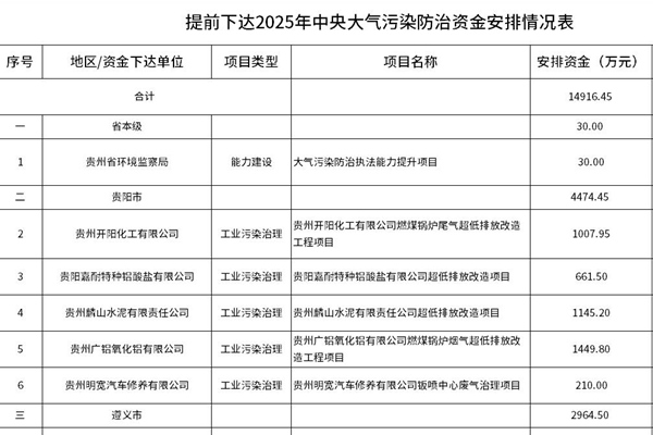 省财政厅关于提前下达2025年中央大气污染防治资金预算的通知黔财资环〔2024〕119号 有关市(州)财政局,省环境监察局: 根据《财政部关于提前下达2025年大气污染防治资金预算的通知》(财资环〔2024〕134号),现提前下达2025年中央大气污染防治资金预算14916.45万元,有关事项通知如下: 一、省本级请将该项资金支出列...