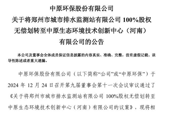 2024年12月26日, 中原环保股份有限公司发布《关于将郑州市城市排水监测站有限公司100%股权无偿划转至中原生态环境技术创新中心(河南)有限公司的公告》。图源:中原环保公告 公告称,为推进资源有效整合,形成业务协同、优势互补的生产经营体系,更好地促进研发与生产紧密结合。中原环保将郑州市污水净化有限公司全资子公司郑州市城市排水监测...