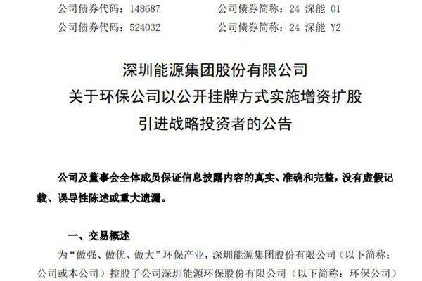 一个月前,深圳能源集团股份有限公司(简称:深圳能源)发布提示性公告称,其控股子公司深圳能源环保股份有限公司(下称:深能环保)拟在深圳联合产权交易所预挂牌,以增资扩股方式引入战略投资者,后者持股比例合计不超过35%。今天(12月20日),深圳能源发布正式公告,明确具体的挂牌方案及影响、风险等。 正式方案中,战略投资者对深能环保的持股比...