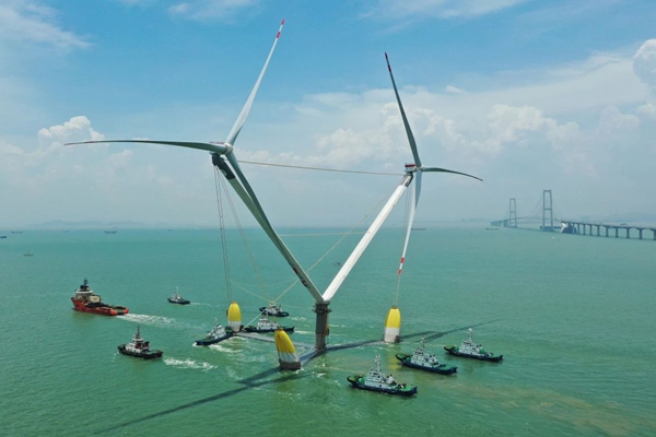 日前,在离岸约70公里、水深约45米的广东阳江青洲四海上风电场由中国电建参建的全球单体容量最大的漂浮式风电平台“明阳天成号”正式投运将拓展全球海上风电开发规模促进海上资源开发与应用 该项目为全球首次在一个浮式基础上搭载两台8.3兆瓦海上风机,总装机容量达到16.6兆瓦,叶轮最高处达219米,空中最大宽度约为369...