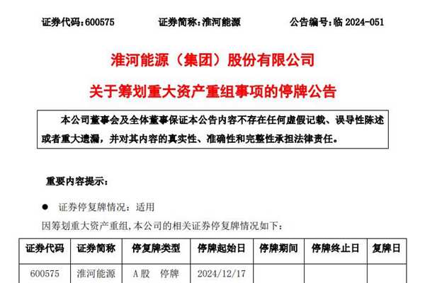 淮河能源(集团)股份有限公司(简称:淮河能源)公告称,公司正筹划重大资产重组事项,由于交易存在不确定性,为维护投资者利益,避免对公司股价造成重大影响,公司股票自2024年12月17日开市起开始停牌,预计停牌时间不超过10个交易日。 据悉,淮河能源拟通过发行股份及支付现金的方式购买淮河能源电力集团有限责任公司(下称“电力集...