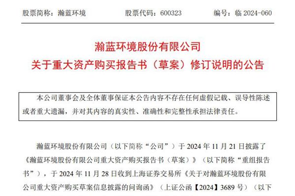 瀚蓝环境股份有限公司(简称:瀚蓝环境)发布《关于重大资产购买报告书(草案)修订说明的公告》。按照 2024 年 11 月 28 日收到上海证券交易所《关于对瀚蓝环境股份有限公司重大资产购买草案信息披露的问询函》(上证公函【2024】3689 号),瀚蓝环境会同中介机构完成了《问询函》相关问题的核查及回复,并根据相关要求对《问询函》回复...