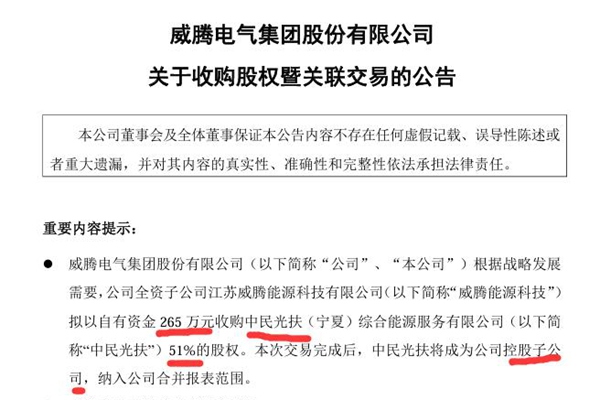 2024年12月13日,威腾电气集团股份有限公司发布《关于收购股权暨关联交易的公告》。图源:威腾电气公告 公告显示,威腾电气全资子公司江苏威腾能源科技有限公司拟以自有资金265万元收购中民光扶(宁夏)综合能源服务有限公司)51%的股权。本次交易完成后,中民光扶将成为威腾电气控股子公司,纳入公司合并报表范围。 本次交易未构成重大资产...