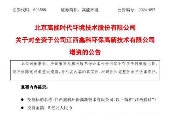 北京高能时代环境技术股份有限公司(简称:高能环境)近日公告称,拟对全资子公司江西鑫科环保高新技术有限公司(下称“江西鑫科”)增资5亿元人民币。本次增资完成后,江西鑫科的注册资本由10亿元变更为15亿元。 高能环境表示,此次增资是为进一步加强江西鑫科多金属资源回收综合利用项目的运营能,增强江西鑫科企业信用等级,...
