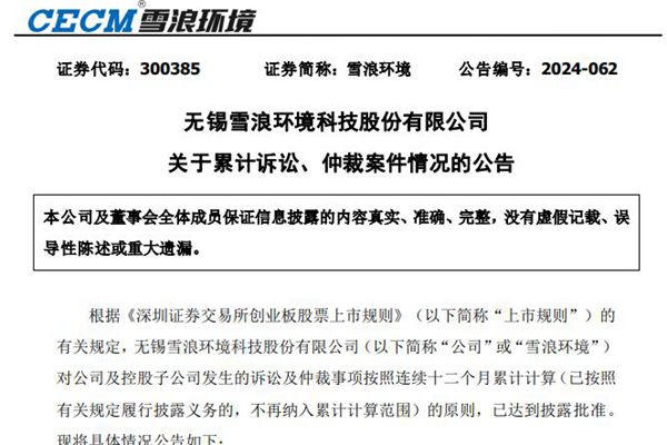 无锡雪浪环境科技股份有限公司(简称:雪浪环境)11月21日发布盘后公告,披露公司累计诉讼、仲裁案件情况。据该公告,雪浪环境及控股子公司连续十二个月内累计发生的诉讼、仲裁金额合计为人民币 7,340.36 万元,占公司最近一期经审计净资产的 10.42%。 雪浪环境是以环境科技装备智造与废弃物资源化利用为主业的国有控股混合所有制上市公...