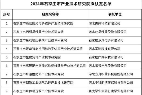 石家庄市科学技术局2024年拟认定市级产业技术研究院评审结果公示 根据《关于申报2024年度市级产业技术研究院的通知》(石科平函〔2024〕3号)和《石家庄市产业技术研究院建设运行与绩效考核管理办法》(石科规〔2022〕1号)的有关规定,市科技局按照双盲评审要求组织开展了市产业技术研究院的认定评审工作,并进行了现场考察,现将拟认定结果予...