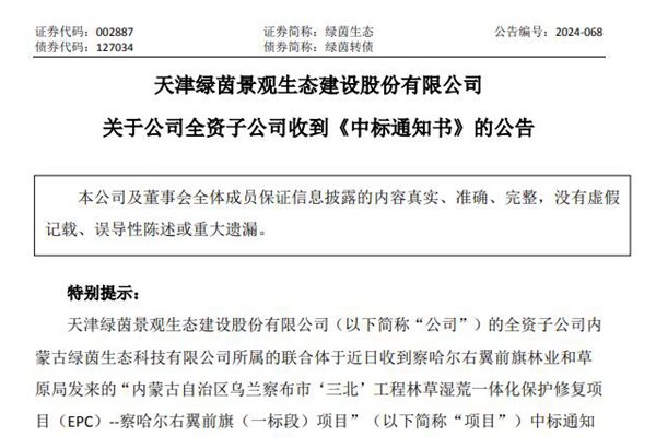 天津绿茵景观生态建设股份有限公司(简称:绿茵生态)近日公告称,公司全资子公司收到了察哈尔右翼前旗林业和草原局发来的“内蒙古自治区乌兰察布市‘三北’工程林草湿荒一体化保护修复项目(EPC)--察哈尔右翼前旗(一标段)项目”(以下简称“项目”)中标通知书。 项目主要...