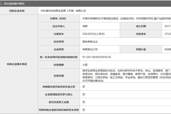 来自北京产权交易所的消息显示,中科海洋生物再生资源(天津)有限公司20%股权挂牌转让,转让底价34.75万元,信息披露结束日期为2024年11月18日。图源:北京产权交易所公告 中科海洋生物再生资源(天津)有限公司注册资本500万元,成立于2017年,实收资本375万元,属于国有参股企业,经营范围—— 海洋...