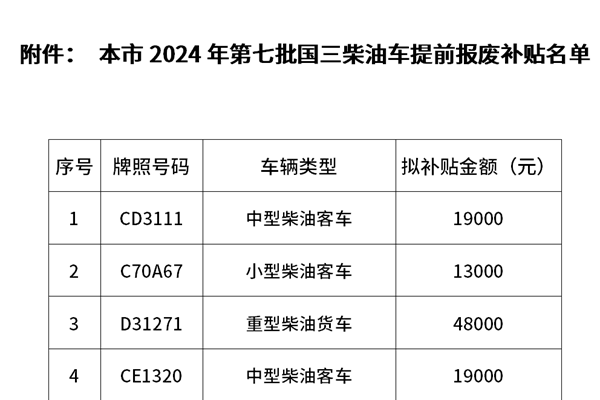 关于本市2024年第七批国三柴油车提前报废补贴名单的公示 根据《上海市生态环境局、市发展改革委、市交通委、市商务委、市公安局、市财政局、市机管局关于发布〈上海市进一步鼓励国三柴油车提前报废补贴实施办法〉的通知》(沪环规〔2022〕9号)规定,我局会同相关部门对提出本市国三柴油车提前报废补贴的车辆进行了审核。现将经过初审符合要求拟予补贴的...