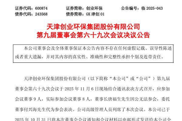 天津创业环保集团股份有限公司(简称:创业环保)于2025年11月6日召开九届董事会第六十九次会议,审议并通过了多项议案。董事会同意聘任齐丽品女士为公司总审计师,任期自即日起至第九届董事会届满;聘任高珺女士为公司总法律顾问、首席合规官,任期自即日起至第九届董事会届满。 齐丽品女士,48岁,高级经济师,毕业于南开大学国际商学院经济信息管...