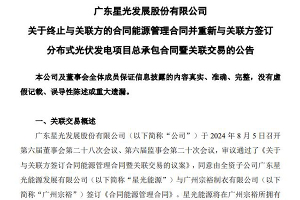 2024年10月16日,广东星光发展股份有限公司发布了《关于终止与关联方的合同能源管理合同并重新与关联方签订分布式光伏发电项目总承包合同暨关联交易的公告》。图源:星光股份公告 公告表示,基于实际情况需要,星光能源拟与广州宗裕签订《合同能源管理合同终止协议》,并由公司全资子公司中能建工(广东)能源技术有限公司与广州创科光伏电力有限公司...