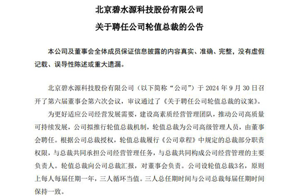 2024年9月30日,北京碧水源科技股份有限公司发布《关于聘任公司轮值总裁的公告》。图源:碧水源 公告称,为更好适应公司经营发展需要,建设高素质经营管理团队,推动公司高质量可持续发展,公司拟推行轮值总裁机制,轮值总裁为公司高级管理人员,由董事会聘任。 公告表示,经公司总裁提名、董事会提名委员会审核通过、同意聘任陈春生先生为首任轮值...