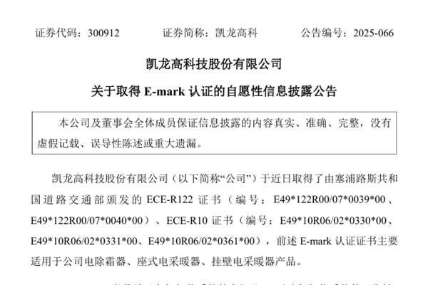 凯龙高科技股份有限公司(简称:凯龙高科)近日公告称,公司取得了由塞浦路斯共和国道路交通部颁发的ECE-R122 证书(编号:E49*122R00/07*0039*00、E49*122R00/07*0040*00)、ECE-R10 证书(编号:E49*10R06/02*0330*00、E49*10R06/02*0331*00、E49*1...
