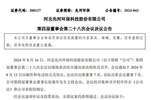 9月3日,河北先河环保科技股份有限公司(简称:先河环保)发布《第五届董事会第一次会议决议公告》,宣布通过《关于选举公司第五届董事会董事长的议案》,同意选举公司董事姚国瑞先生为公司第五届董事会董事长,任期三年,自本次董事会通过之日起至第五届董事会届满之日止。 同时,选举公司第五届董事会四个专门委员会组成人员: (一)审计委员会:朱艳...