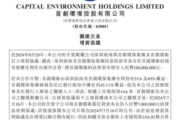 2024年8月21日,首创环境控股有限公司发布《关联交易增资协议》的公告。 8月20日,公司的全资附属公司深圳前海与首创环保集团及首创环卫订立增资协议,据此,深圳前海及首创环保集团同意按彼等各自于首创环卫的现有股权比例作出额外注资,即首创环保集团及深圳前海分别作出额外注资人民币4419.61万元及人民币4600万元,首创环卫的注册资...