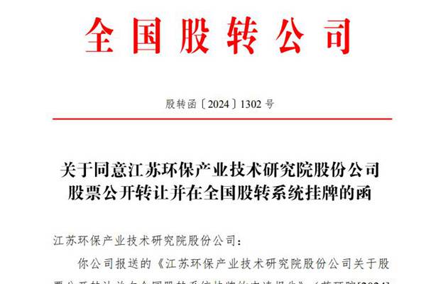 据江苏环保产业技术研究院股份公司(简称:苏环院)公告,公司已经收到全国股转公司《关于同意江苏环保产业技术研究院股份公司股票公开转让并在全国股转系统挂牌的函》(股转函〔2024〕1302号)。这意味着,苏环院已经完成全国股转公司审核的关键步骤,可以进入后续的登记挂牌阶段,包括分配股票代码、办理股份登记存管以及公司挂牌等程序,如进展正常,...