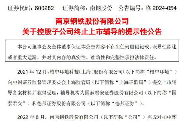 南京钢铁股份有限公司(简称:南钢股份)7月9日晚间公告称,鉴于实控人变更影响,并综合考虑战略发展及资本运作规划,公司控股子公司柏中环境科技(上海)股份有限公司(简称“柏中环境”)终止上市辅导事项。2024年7月8日,上海证监局确认柏中环境终止辅导。 据悉,2021年12月,柏中环境向上海证监局提交上市辅导备案...