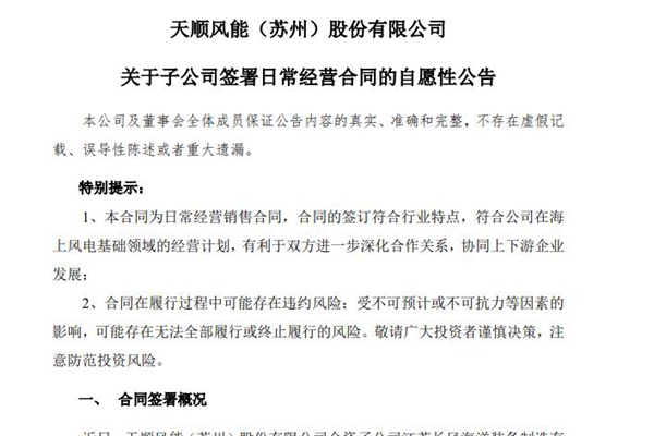 天顺风能(苏州)股份有限公司发布《关于子公司签署日常经营合同的自愿性公告》,江苏长风、南通长风分别承接华润连江外海海上风电场项目合计9台导管架制作加工项目,总计 16,411.5 吨。 天顺风能在公告中提到,华润连江外海海上风电项目为福建省2022年海上风电首批竞争配置项目,也是国内首个批量化使用单机容量最大机型—18M...