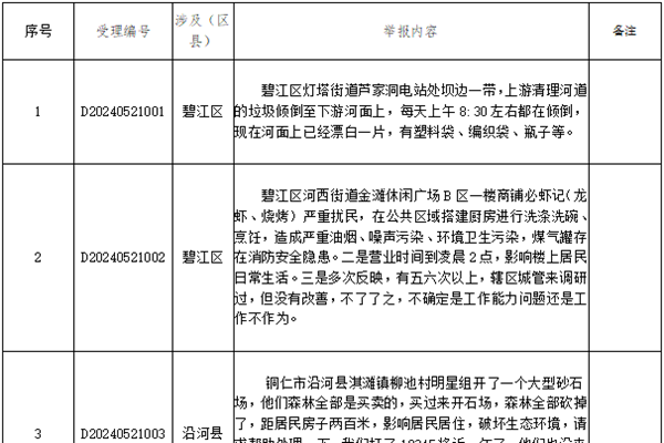 5月21日,贵州省第八生态环境保护督察组转交铜仁市6件群众举报,其中大气污染问题1件、水污染问题1件、生态破坏问题1件、噪声污染问题1件、畜禽养殖污染问题1件、其他污染问题1件。 这些举报涉及河道垃圾倾倒下游,商铺扰民(油烟、噪声、环境卫生等),砂石场破坏生态环境,小区生活垃圾站设置不合理,KTV噪声扰民,养殖场污染等等问题。 原...