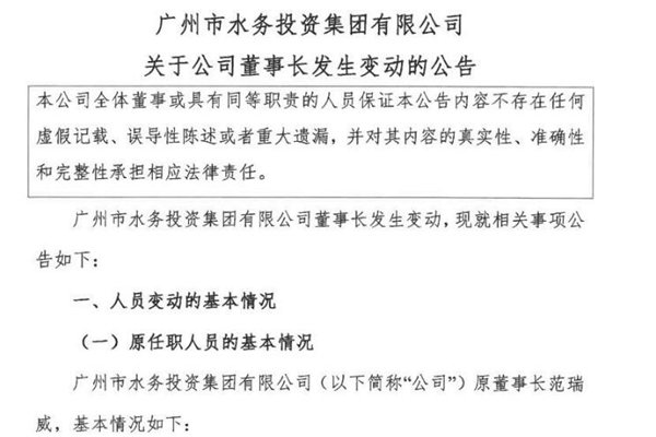 广州市水务投资集团有限公司接连发布关于公司董事长、高管发生变更的公告: 免去范瑞威同志广州市水务投资集团有限公司党委书记、董事长职务。 申石泉同志不再担任广州市水务投资集团有限公司党委委员、副总经理职务。 周军同志任广州市水务投资集团有限公司党委委员、副总经理。孙伟同志任广州市水务投资集团有限公司党委委员、副总经理。 高跃生同...