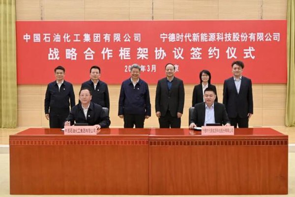 3月13日,中国石化集团与宁德时代新能源科技股份有限公司在北京签署战略合作框架协议。中国石化集团公司董事长、党组书记马永生先生,宁德时代董事长、总经理曾毓群先生一行见证签约。中国石化集团公司党组成员、副总经理吕亮功与宁德时代市场体系联席总裁谭立斌代表双方签署协议。 根据协议,双方将推动光储充微电网技术示范应用。依托合资公司,加快乘用...
