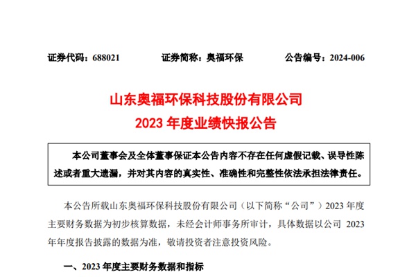 《山东奥福环保科技股份有限公司2023年度业绩快报公告》近日发布,详情如下: 报告期内,公司实现营业收入 33,226.08 万元,较上年同期增长 63.06%;实现归属于母公司所有者的净利润-769.91 万元,较上年同期亏损收 窄;实现归属于母公司所有者的扣除非经常性损益的净利润-1,631.15 万元,较上 年同期亏损收窄。 ...