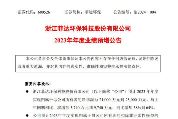 1月26日,菲达环保公布2023年年度业绩预增公告,经初步测算,预计其2023年年度可实现归属于母公司所有者的净利润为21,000万元到25,000万元,与上年同期(2022年法定披露数据)相比,将增加5,740万元到9,740万元,同比增加38%到64%。经公司财务部门初步测算,预计公司2023年年度实现归属于母公司所有者的扣除非经...