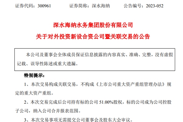 深水海纳水务集团股份有限公司2023年12月25日公告,公司拟与深圳开鸿数字产业发展有限公司、深圳市海纳创展科技有限公司共同设立华鸿海纳物联技术(深圳)有限公司(以下简称“华鸿海纳”,暂定,最终以市场监督管理部门核定为准)。 深水海纳在公告中表示,其一,本次对外投资及合作,将加快推动公司在生态环境智慧治理和智...