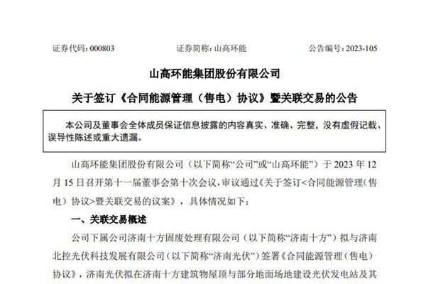 12月16日,以餐厨废弃物处置为主业的A股上市公司山高环能集团股份有限公司(简称:山高环能)发布公告,宣布将利用旗下济南市餐厨废弃物处理项目建筑物屋顶建设光伏电站及其配套设施,该光伏电站预计每日可为该项目提供不高于1370kwh电量。 公告显示,山高环能下属公司济南十方固废处理有限公司(简称“济南十方”)拟与...