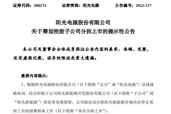 12月8日,阳光电源股份有限公司(简称:阳光电源)发布“关于筹划控股子公司分拆上市的提示性公告”,分拆对象为阳光新能源开发股份有限公司(下称“阳光新能源”),目标是境内证券交易所。 对于此次分拆子公司上市的目的,阳光电源表示,主要是为了充分利用资本市场优化资源配置的功能,拓宽子公司的融...