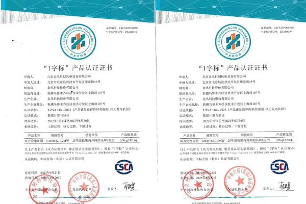 近日,金风科技获得由中关村标准化协会和中标合信(北京)认证有限公司联合颁发的“风力发电机碳足迹暨‘1字标’产品认证证书”。这也是国内首个风电产品碳足迹核算证书。该证书填补了我国风电产品碳足迹核算、认证和公开方面的空白,可为验证风电产品低碳性、推动中国风电高水平“走出去&rdq...