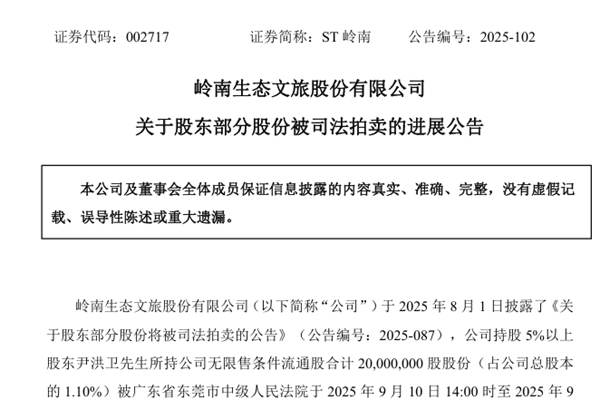 岭南生态文旅股份有限公司(简称:ST岭南)近日公告称,公司持股5%以上股东尹洪卫先生所持公司无限售条件流通股合计20,000,000股股份(占公司总股本的1.10%)被广东省东莞市中级人民法院于2025年9月10日14:00时至2025年9月11日14:00时在京东网络司法拍卖平台上进行司法拍卖。本次拍卖已按期进行,现将本次司法拍卖结...