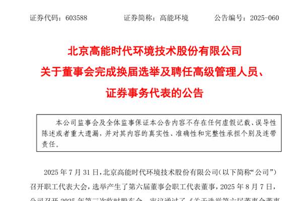 北京高能时代环境技术股份有限公司(简称:高能环境)公告称,8月7日,公司召开2025年第三次临时股东会,审议通过了《关于选举第六届董事会董事的议案》《关于选举第六届董事会独立董事的议案》;同日,公司召开第六届董事会第一次会议,审议通过了选举董事长、副董事长、各专门委员会委员和组成、聘任高级管理人员、证券事务代表等议案。 一、公司第六...