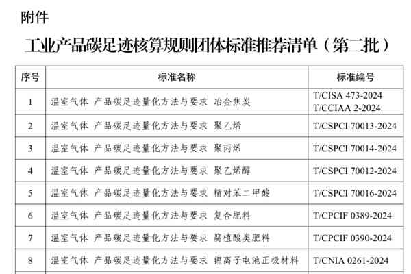 关于公布工业产品碳足迹核算规则团体标准推荐清单(第二批)的通告 工信部联节函〔2025〕141号 为加快提升工业产品碳足迹管理水平,建立健全碳足迹管理体系,促进工业绿色低碳转型,经相关标准化机构推荐、专家评审、网上公示等程序,工业和信息化部、生态环境部、国家发展改革委、市场监管总局确定了23项工业产品碳足迹核算规则团体标准推荐清单...