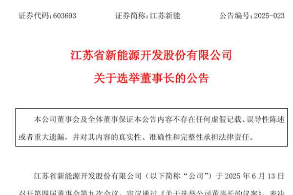 江苏省新能源开发股份有限公司(简称:江苏新能)近日公告称,公司同意选举陈华先生为公司第四届董事会董事长,根据《江苏省新能源开发股份有限公司战略委员会议事规则》相关规定,由董事长陈华先生担任公司第四届董事会战略委员会主任委员职务,上述任期自董事会审议通过之日起至第四届董事会届满为止。 同时,根据《江苏省新能源开发股份有限公司章程》,董...