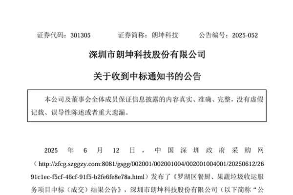 深圳市朗坤科技股份有限公司(简称:朗坤科技)公告称,公司已收到罗湖区餐厨、果蔬垃圾收运服务项目的中标通知书,中标金额为21,567,120.00元。 中标通知书主要内容 1、项目名称:罗湖区餐厨、果蔬垃圾收运服务项目 2、招标单位:深圳市罗湖区城市管理和综合执法局 3、中标单位:深圳市朗坤科技股份有限公司 4、项目服务内容:...