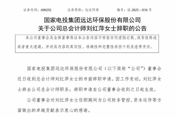国家电投集团远达环保股份有限公司(简称:远达环保)近日两则公告称,因工作变动,刘红萍女士辞去公司总会计师职务,辞职申请自公司董事会收到之日起生效。刘红萍女士离任后,其所负责的工作已经做好交接安排,不会对公司的正常经营产生影响。 提前离任的基本情况↓图源:远达环保公告 申明:本站发布此信息的目的在于传播更多信息,与本站立场...