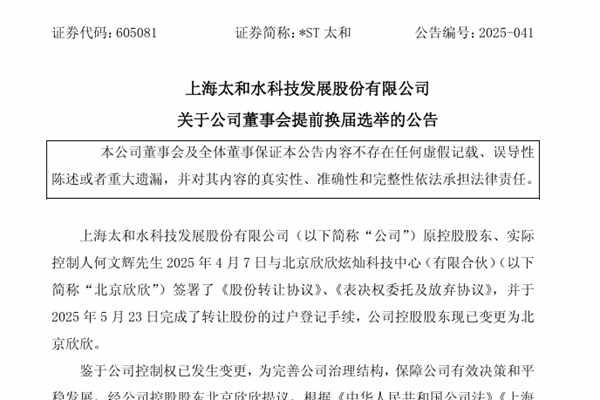 上海太和水科技发展股份有限公司(简称:太和水)近日公告称,鉴于公司控股股东已变更为北京欣欣炫灿科技中心(有限合伙),为完善公司治理结构,保障有效决策和平稳发展,公司董事会将提前换届选举。据悉,太和水第四届董事会将由9名董事组成,其中非独立董事6名、独立董事3名,任期三年,自2025年第二次临时股东大会审议通过之日起就任。详情如下&da...
