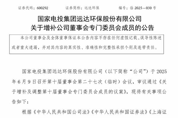 国家电投集团远达环保股份有限公司(简称:远达环保)近日公告称,为进一步优化董事会专门委员会专业配置,充分发挥董事在战略规划、审计监督及风险管控领域的专业优势,提升公司治理效能,经第十届董事会第二十七次(临时)会议审议通过,对董事会专门委员会委员组成进行调整及增补。公司调整现战略与投资委员会委员马天峰先生为审计与风险委员会委员;增补董事...