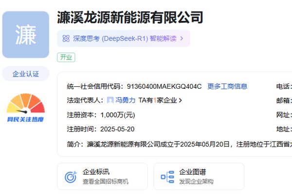 5月20日,濂溪龙源新能源有限公司正式成立,注册资本1000万元,经营范围包含: 【许可项目】发电业务、输电业务、供(配)电业务(依法须经批准的项目,经相关部门批准后在许可有效期内方可开展经营活动,具体经营项目和许可期限以相关部门批准文件或许可证件为准)【一般项目】风力发电技术服务,太阳能发电技术服务,新兴能源技术研发,电气设备修理...