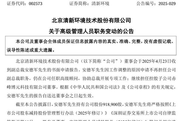 北京清新环境技术股份有限公司(简称:清新环境)近日发布《关于高级管理人员职务变动的公告》。据悉,清新环境董事会于2025年4月23日收到副总裁安德军先生的书面申请报告。安德军先生因工作调整的原因申请不再担任公司副总裁职务,仍在公司任职高级顾问,协助总裁开展专项工作;继续担任控股子公司赤峰博元科技有限公司董事。图源:清新环境公告 申明...