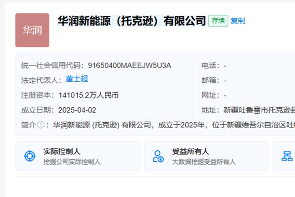 近日,华润新能源(托克逊)有限公司成立,法定代表人为董士超,注册资本约14.1亿人民币。 该公司由华润新能源投资有限公司100%持股,经营范围:【一般项目】风力发电技术服务;太阳能发电技术服务;储能技术服务;发电技术服务;电力行业高效节能技术研发;新兴能源技术研发。(除依法须经批准的项目外,凭营业执照依法自主开展经营活动)【许可项目...