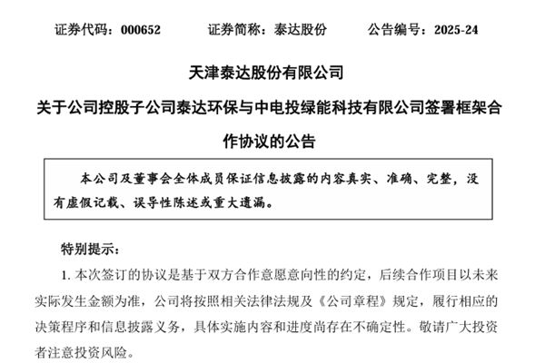 4月9日,天津泰达股份有限公司(简称:泰达股份)发布公告,宣布控股子公司天津泰达环保有限公司(下称“泰达环保”)与中电投绿能科技有限公司(以下简称“中电绿能”)签署《框架合作协议》(下称“协议”),拟在环保类项目的投资运营方面进行合作。双方将本着互惠互利、优势互补...