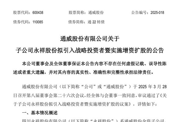 3月29日,光伏巨头通威股份有限公司(简称:通威股份)发布公告,宣布其全资子公司四川永祥股份有限公司(下称“永祥股份”)拟通过增资扩股方式引入战略投资者,进一步夯实资本实力。 根据公告,永祥股份此次增资前股权估值达270亿元,计划引入资金不超过100亿元,战略投资者预计持有增资后永祥股份不超过27.03%的股...