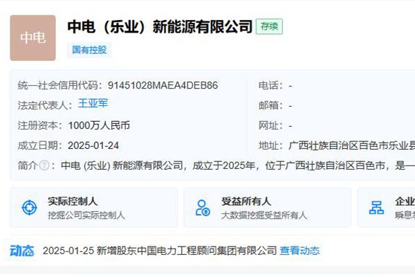 近日,中电(乐业)新能源有限公司成立,法定代表人为王亚军,注册资本为1000万元,经营范围:许可项目:发电业务、输电业务、供(配)电业务。(依法须经批准的项目,经相关部门批准后方可开展经营活动,具体经营项目以相关部门批准文件或许可证件为准)一般项目:技术服务、技术开发、技术咨询、技术交流、技术转让、技术推广;新兴能源技术研发;太阳能发...