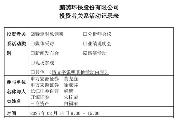 2025年02月13日,鹏鹞环保股份有限公司发布《投资者关系活动记录表》。图源:鹏鹞环保公告 1、公司2025年水务投资运营主要方向和抓手。 答:公司 2025 年水务投资主要方向为推广及应用公司发明的未来水厂(SEED 水厂)成套技术及装备。SEED水厂技术打破了传统水厂以钢混结构为主的施工建造形式,采用钢结构替代钢混结构,使水...